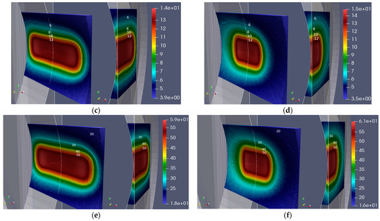 Helium production is also a crucial aspect of the irradiation field since different amounts of helium result in a large impact on the DBTT (Ductile–Brittle Transition Temperature) [16] with a similar level of DPA. Therefore, the ratio of the helium production rate to the damage rate (the He–DPA ratio) was calculated and is shown in Figure 7c,d. Knowing that the He–DPA ratio of 11–12 He-appm/dpa are typical values at the DEMO first-wall [4], the values of 10–14 He-appm/dpa observed on the BP footprint area are very similar. Figure 7e,f present hydrogen production in a similar way as helium production. Compared with the DEMO first-wall conditions of 45–55 H-appm/dpa, the H–DPA ratio of 50–60 H-appm/dpa on the BP is comparable as well. Such irradiation conditions provided by the IFMIF-DONES facility are unique in the sense of their high damage dose and similar gas production, which allows for the qualification of structural materials for the first-wall of the DEMO reactor and of future fusion machines beyond it.