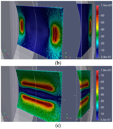 The DPA, helium productions, and hydrogen productions are quantities of interest for material irradiation. The DPA plot in Figure 7a has good consistency with Figure 5 after the interpolation was carried out, showing that 30 dpa/fpy can be reached at the BP’s center. With the “10 × 5” footprint, it reaches very promising values of 50–60 dpa/fpy. It should be noted that as the HFTM irradiation volume above 20 dpa/fpy is very limited [4], the additional volumes provided by the BP are particularly valuable.