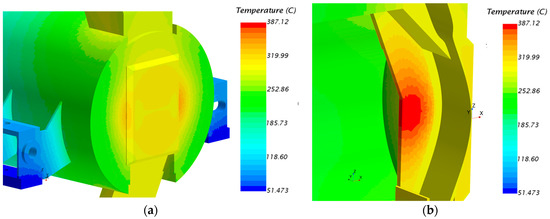 Temperature (°C) distribution of the TA and the BP. (a) isometric view; (b) cut-view through the TA’s center.