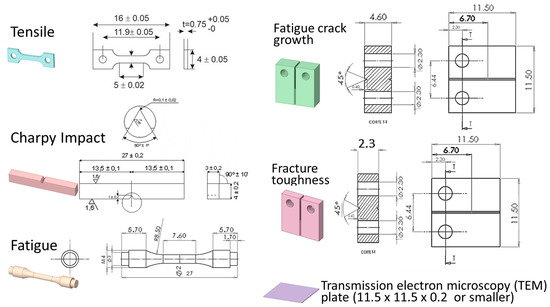 To produce material samples from the BP, it is planned to cut the BP into small blocks and then machine them to the standard size of the SSTT specimens. Since the high-DPA volume over the BP is small, a well-elaborated cutting scheme can help produce as many useful samples as possible. The dimensions of the SSTT specimens (Figure 10) have been taken from [18]. The thickness of the specimen is an important factor, since the small thickness of the BP prevents some types of specimens from being produced from the center volume. Additionally, the enclosure’s dimensions and volumes are useful for estimating the number of allowable samples and the average DPA over them. The enclosures are defined based on a specimen bounding-box with a small margin of 0.2 mm on each side, which could be useful for future high-precision cutting. Depending on the technologies used in the future PIE (Post-Irradiation Examination) facilities, high-precision cutting, e.g., laser cutting [19], produces a cut width of 0.4 mm, while an Electrical Discharge Machine (EDM) can produce a smaller cut width depending on the wire it uses [20]. However, it is conservative to expect a cut width of 1.0–2.0 mm.
