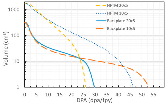 The whole BP component has a material volume of 8800 cm3 overall, while the thickness (in the X direction shown in Figure 1) of 0.18 cm for the beam footprint area is small to reduce neutron absorption. This work focuses on a high-DPA segment of the BP shown in Figure 1 (slightly larger than the nominal beam footprint area of 20 cm × 5 cm), which covers an area of the full width of the flow channel and a height of ±9 cm at the BP’s center. Although the volume of this segment (318 cm3) is not large, it is considered meaningful since the total irradiation volume of the HFTM is only ~860 cm3 for the 16 central capsules [6].