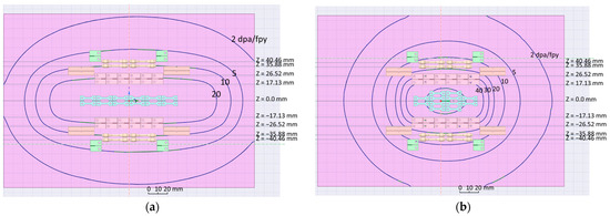 The specimen arrangements for BP with two footprints. The pink area represents the actual size of the BP high-DPA region, the dark-blue lines are the DPA contours, and the specimens are shown in the same dimension scale as the BP. The Z coordinate value given on the right size indicates the vertical positions that allow for different types of specimens based on their thicknesses. (a) “20 × 5”; (b) “10 × 5”.