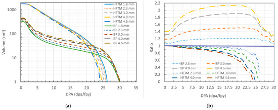 The impact of BP thickness increase on the irradiation volume of BP and HFTM under the “20 × 5” footprint. (a) Presents the integral volume over the DPA value and (b) provides the ratio of others to the reference case of 1.8 mm-thick BP.