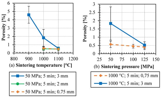 Residual porosity of sintered 50 W composites: (a) Effect of sintering temperature and consolidate’s thickness as well as the effect of 50 W composition (50W10–30+50S10–20 and 50W10–30+50S3–13); (b) Effect of sintering time and pressure for the 50 W composition (50W10–30+50S3–13).