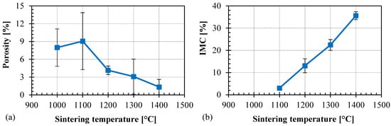 (a) Porosities and (b) IMC of 75 W composites sintered at different temperatures. (Note: for the sintering performed at 1000 °C, the amount of IMC could not be determined using image analysis as it was very minimal. However, it must be noted that even at 1000 °C, there will be generation of IMC, but its amount is not high enough to be captured by image analysis).