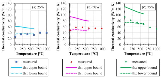 Measured and theoretically expected lower and upper bound values: (a) 25 W; (b) 50 W; and (c) 75 W composite.