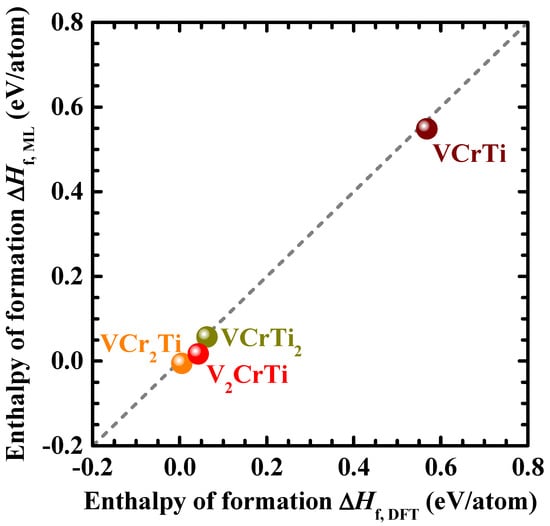 Figure 1 presents the correlation between the enthalpy of the formation of the V–Cr–Ti alloys, computed by the ElemNet machine learning model and DFT calculations registered in the Open Quantum Materials Database. Only four DFT data points are available for ternary V–Cr–Ti compounds in the Open Quantum Materials Database as of March 2023, reflecting the difficulty of using first-principle calculations for multicomponent alloys and indicating the necessity of machine-learning-based prediction. Despite the small number of datasets, an excellent agreement between the machine learning prediction and the DFT values is observed in Figure 1, with a mean absolute error of 0.015 eV/atom.