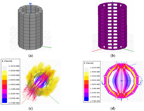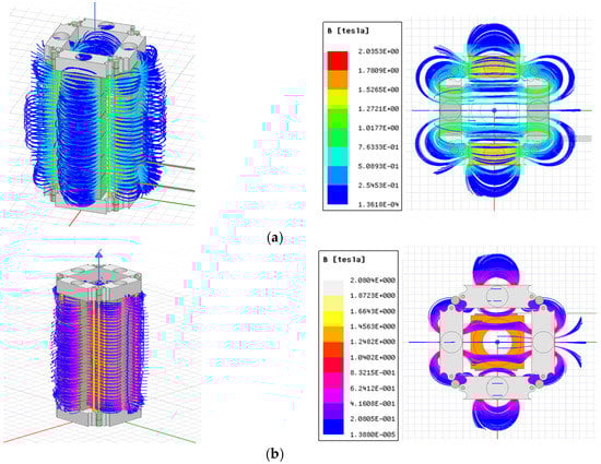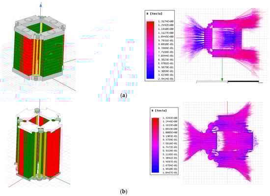 The next design featured a rectangular structure, and two designs of different sizes were considered. The streamlines clarify the idea of Halbach arrays in the NMR application. Figure 3 shows the 3D designs and the Ansys Maxwell software output after simulating the whole system, respectively. Figure 3a has a height of 14.84 cm with a diameter of 2.83 cm, whereas Figure 3b has a height of 15.3 cm and a diameter of 5.6 cm. As can be seen, decreasing the air gap improves the homogeneity level of the magnetic field. However, this can be a restriction in a real prototype from two viewpoints: First, the pulling magnetic force increases extremely, and second, there will not be sufficient space for running laboratory tests when a holder around a tube is required to measure flow.