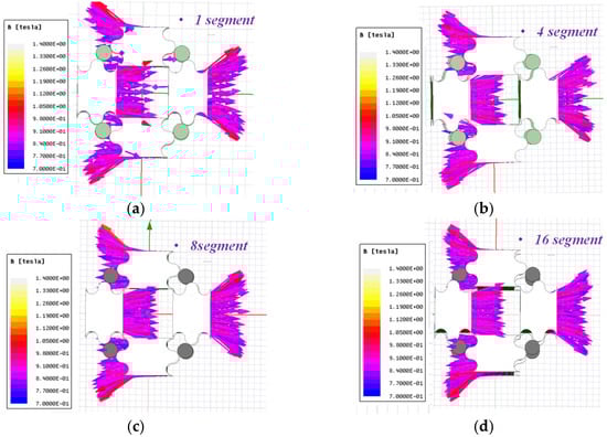 Evaluating the effect of the number of magnetic segments on the magnetic field homogeneity: (a) one magnetic segment NMR structure; (b) four magnetic segments NMR structure; (c) eight magnetic segments NMR structure; (d) sixteen magnetic segments NMR structure.