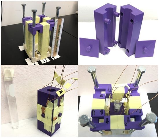 To minimize the weight of the portable NMR structure, the top and bottom bases for the magnet arrays were fabricated using a polylactide (PLA) material. Another important part of this portable NMR device is the holder assembly (upper right image in Figure 5) that houses the tube or plant stem in a flow measurement setup. The placement and alignment of this holder assembly in the NMR structure highly impact the sensitivity of the obtained results and hence are one of the most challenging aspects of the NMR tool. Thus, it was designed in a way that it can easily be opened/closed with minimum lateral movement. In addition, the simplicity of this design decreases the risk of misalignment that might occur during repeated opening and closing of the holder assembly. Additionally, it was investigated during experimental testing that to achieve best results the holder assembly (with the tube or plant stem) should be placed in the RoT of the NMR structure that has the strongest and most homogenous magnetic field.