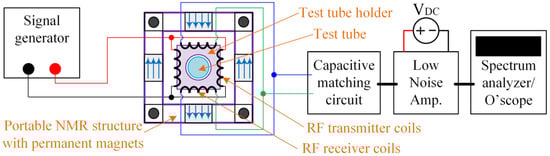The portable NMR experimental setup is designed to replicate a proper setup for the flow measurement study in a tube or plant stem. A proper testbed should consider all the ambient conditions that could impact the performance of the NMR tool. Logically, the functionality of the designed tool should be evaluated in the laboratory via some scenarios under conditions similar to in situ. If the designed tool under the specific test could achieve promising outcomes, the prototyped NMR functionality would provide reasonable results in the real-life application. However, some parameter re-tuning was needed to achieve stable functionality. Additionally, some mechanical fixtures needed to support the entire structure in the field were designed. It should be remarked that the surrounding test area can have a high impact on the high-frequency transmitter and receiver coils. Hence, the test was conducted under conditions with the lowest external interfering factors. The water sample in the glass tube was excited by a chain of pulsating magnetic fields generated by the radio frequency excitation pulses. This generated magnetic field was perpendicular to the static magnetic flux. The hydrogen atom’s reaction as reflected waves (reflected signal) was captured by the receiver coils, which were then fed to the spectrum analyzer. These reflected waves corresponding to the reaction of the hydrogen atom are used in determining the Larmor frequency. To improve the SNR of the captured waveform, the matching circuit and RF-LNA were used as an interface between the receiver coils and the spectrum analyzer. The RF-LNA was powered by a DC power supply as shown in Figure 6.