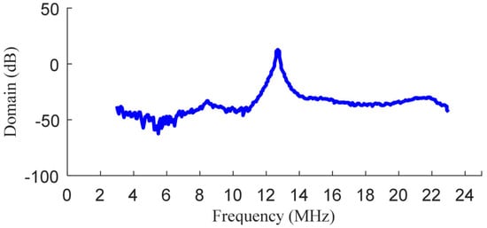 Output reaction in frequency domain when the system was excited by a 12.7 MHz radio frequency signal. Resonant was observed in this test.