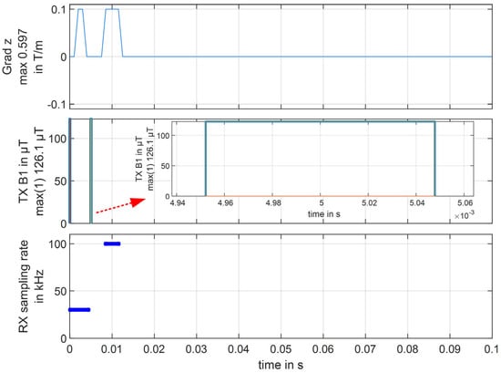 In this test we determine and capture the free induction decay (FID) curve for stationary water. However, some parameters needed to be adjusted before running any tests, such as the Larmor frequency, radio frequency at 90-degree pulse duration, shim values, an optimum span around the Larmor frequency, the number of measurements for both transmitter and acquisition trains, and the number of samples in each measurement. Figure 9 shows how a simple spin echo was created with gradients. As a side note, fast Fourier transformation (FFT) was applied to the encoded spin-echo signal, which shows a profile of the sample. Here, the echo time was 10 ms, and the repetition time was set equal to 100 ms. Regarding the acquisition parameters, it started after 0.1 ms and applied the 90-degree signal.