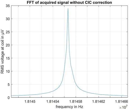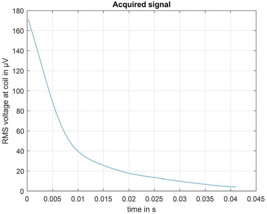 To provide an FID for the sample under study, we needed to apply an excitation pulse and then acquire the impacted signal based on the abovementioned points. Figure 10 shows the acquired signal for peaks of the FID curve when tap water was used as a test sample. Due to capturing the atom’s reactions in terms of the induced voltage in the receiver coil, this figure illustrates the decay of the RMS voltage at the coil after removing the excitation signal from the system. Note that this value started from ~180 µV and decreased to 0 µV after 0.045 s. Due to the occurrence of resonance when the atoms were excited by an RF signal at a specific frequency, the FID curve was presented in the frequency domain after applying the FFT over it. Figure 11 shows the Larmor frequency for this test. The value of the Larmor frequency depends on the magnitude of the constant magnetic field and the material, which is being tested. Based on our magnetic device features, we found the Larmor frequency was around 18.145 MHz. Considering the differences in constant magnetic field values, the obtained results from this off-the-shelf lightweight NMR tool with magnetic resonance imaging spectrometer are validating what was observed for the Larmor frequency from the optimally prototyped portable NMR tool. However, the limitation of the off-the-shelf setup is its mechanical structure and weight, which may not be feasible for applications, such as sap flow measurements in a plant’s stem. The optimally prototyped tool provides this feature while ensuring accurate measurements. It worth mentioning that the prototyped magnetic structure of Figure 1, if manufactured in a highly precise industrial setting, would yield a much lower mismatch of the magnetic field strength and homogeneity as compared with the simulation results, which results in more accurate measurements.
