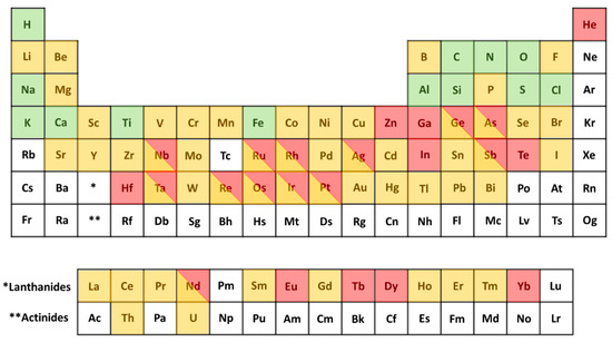 Periodic table of critical and endangered materials. Key: Stable supply. Supply at Risk. Supply Endangered.