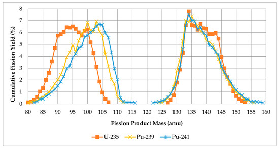 Cumulative fission yields by overall chain yield from U-235, Pu-239, and Pu-241. (Own work—data from IAEA Isotope Browser App [50]).