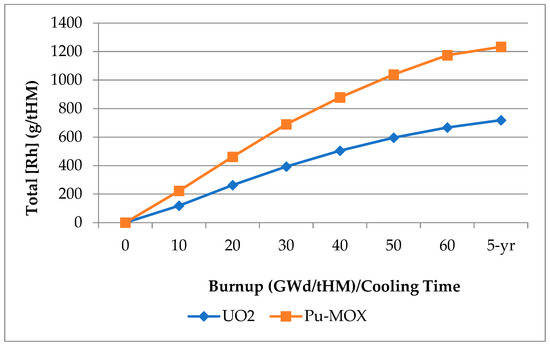 Variation in [Rh] in nuclear fuel with level of irradiation up to 60 GWd/tHM burnup for UO2 (5% initial U-235) and Pu-MOX (7.84% initial [Pu]), including values for 5-year post-irradiation cooled SNF [51]. tHM = tons of heavy metal.