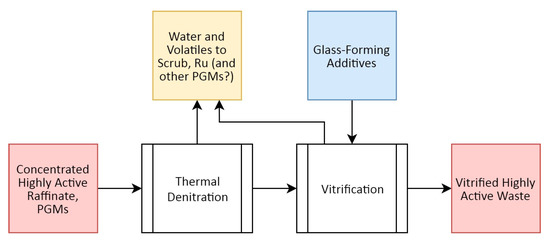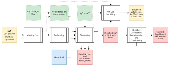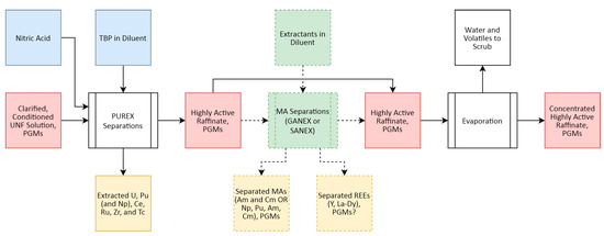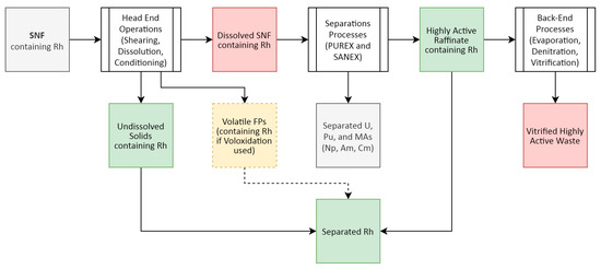 Figure 4 presents a high-level overview of the PUREX (plutonium and uranium redox extraction) process, the most commonly employed SNF reprocessing flowsheet [57], and where Rh recovery can be targeted.