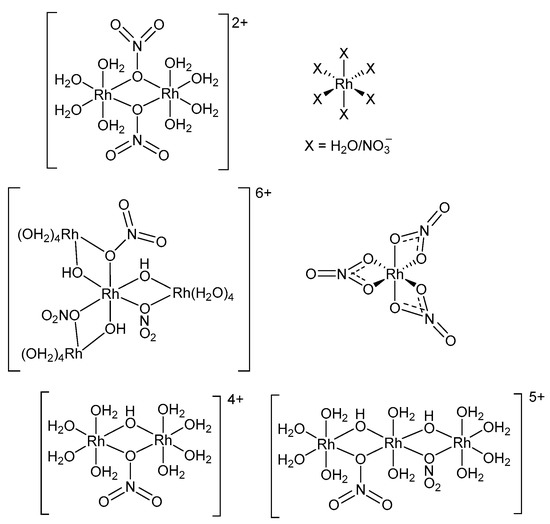 - Belyaev, A.V.; Fedotov, M.A.; Khranenko, S.P.; Emel’yanov, V.A. Forms of Rh(III) in Nitric Acid Solutions. Russ. J. Coord. Chem. 2001, 27, 855–864. [Google Scholar] [CrossRef]