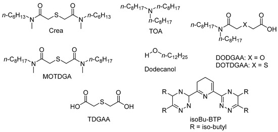 - Zalupski, P.R.; Klaehn, J.R.; Peterman, D.R. Complete Recovery of Actinides from UREX-like Raffinates Using a Combination of Hard and Soft Donor Ligands. II. Soft Donor Structure Variation. Solv. Extr. Ion Exch. 2015, 33, 523–539. [Google Scholar] [CrossRef]