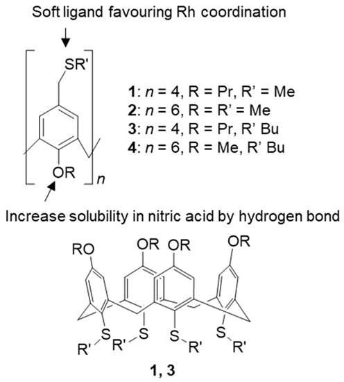 - Torgov, V.G.; Tatarchuk, V.V.; Druzhinina, I.A.; Korda, T.M. Extraction of triaquatrinitrorhodium form with calix[n]arenethiaethers from nitric acid nitrite–nitrate solutions. Russ. J. Inorg. Chem. 2016, 61, 1054–1059. [Google Scholar] [CrossRef]