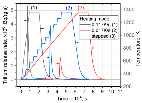 Figure 1 depicts the tritium release behavior of the beryllium matrix fragments that were irradiated in the BR2 reactor and subjected to various heating modes. It is noteworthy that a distinct single tritium release peak is observed in all three cases. These peaks have a similar shape and differ only in height. The peaks have a sharp shape, that is, the main release of tritium occurs in a narrow temperature-time interval. This is the so-called burst tritium release [15,21].