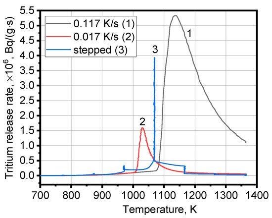 Tritium release rate at permanent heating rates of 0.117 K/s (1), 0.017 K/s (2) and a stepped heating mode (3) with an average heating rate of 0.03 K/s on temperature.