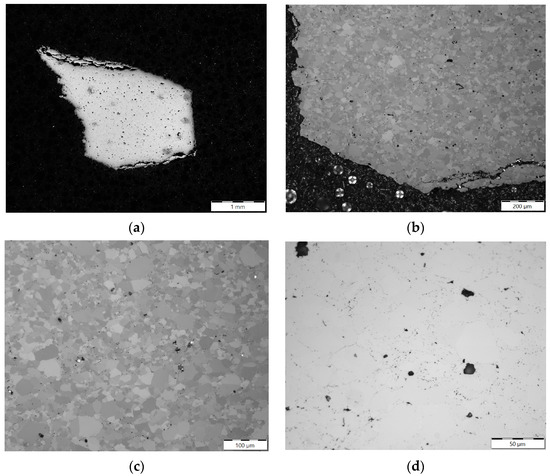 Optical micrographs of irradiated Be fragments, as received: (a) general view of a fragment with irregular shape; (b) cracks located close to cutting place (in polarized light); (c) view of grains (in polarized light); (d) view of pores (black objects).