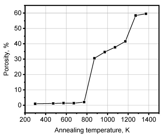 Figure 5 shows the porosity dependence versus annealing temperature. The porosity values increase from the as-received state to the annealing temperature of 773 K but remain at a level of 1–2%. However, a sharp increase in porosity is observed starting from 873 K. The porosity reaches 60% at the highest temperature of 1373 K.