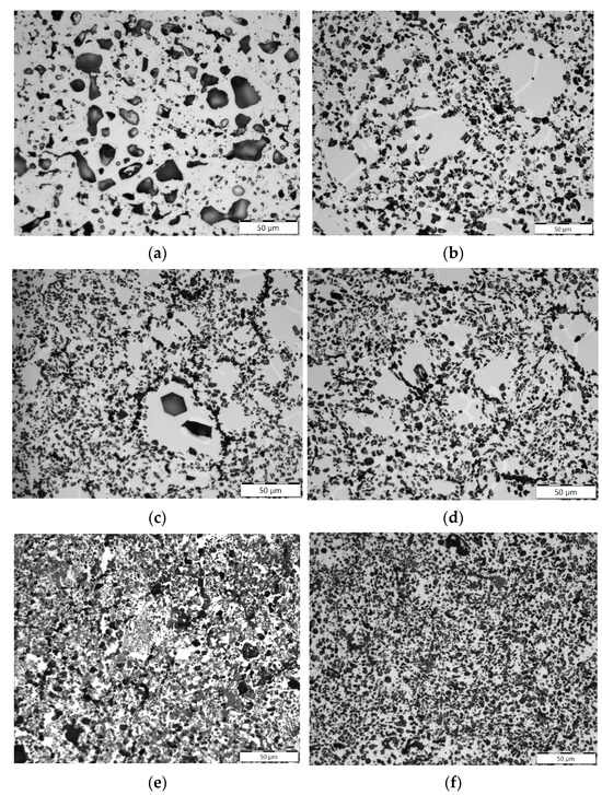 Figure 6 represents optical pictures of the irradiated Be fragments after annealing at temperatures ranging from 873 K to 1373 K for 5 h. A very developed porosity is observed in all images, with large pores and denuded zones around them. The porosity values increase sharply from 30% to 60% on increasing temperature from 873 K (a) to 1373 K (f). At the highest temperatures of 1273 K (e) and 1373 K (f), the pores are densely distributed throughout the structure, and large pores and denuded zones around them are practically absent.