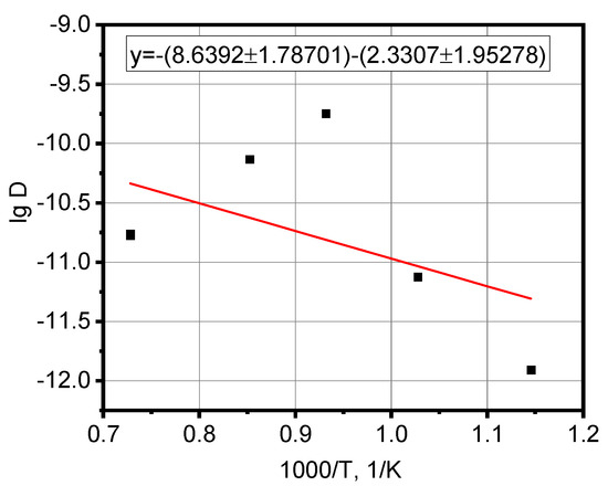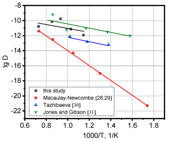Figure 8 demonstrates dependence of lg D on reverse temperature 1/T taken from the literature [28,29,30,31]. The results obtained in this study are more consistent with the data of Tazhibaeva [30] and Jones and Gibson [31].