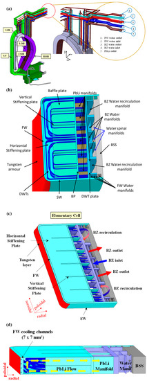 - Del Nevo, A.; Arena, P.; Caruso, G.; Chiovaro, P.; Di Maio, P.; Eboli, M.; Edemetti, F.; Forgione, N.; Forte, R.; Froio, A.; et al. Recent progress in developing a feasible and integrated conceptual design of the WCLL BB in EUROfusion project. Fusion Eng. Des. 2019, 146, 1805–1809. [Google Scholar] [CrossRef]