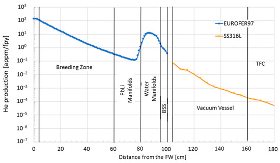 - Chiovaro, P.; Ciattaglia, S.; Cismondi, F.; Del Nevo, A.; Di Maio, P.; Federici, G.; Frittitta, C.; Moscato, I.; Spagnuolo, G.; Vallone, E. Investigation of the DEMO WCLL Breeding Blanket Cooling Water Activation. Fusion Eng. Des. 2020, 157, 111697. [Google Scholar] [CrossRef]