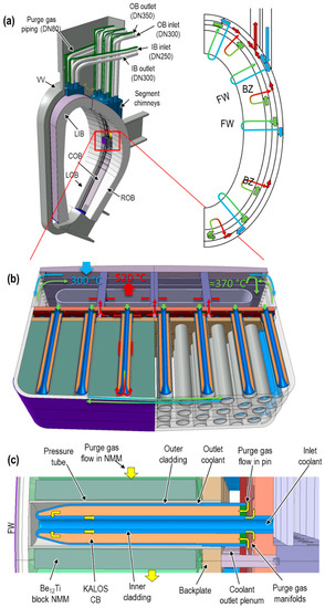 - Spagnuolo, G.A.; Arredondo, R.; Boccaccini, L.; Chiovaro, P.; Ciattaglia, S.; Cismondi, F.; Coleman, M.; Cristescu, I.; D’Amico, S.; Day, C.; et al. Integrated design of breeding blanket and ancillary systems related to the use of helium or water as a coolant and impact on the overall plant design. Fusion Eng. Des. 2021, 173, 112933. [Google Scholar] [CrossRef]