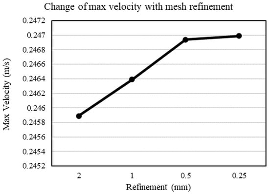 Table 3 lists the number of cells, grid size (calculated using Equation (4)), and the max velocity recorded during the simulation. A difference of 0.0202% is observed in the axial velocity produced by very fine mesh and fine mesh, while for the fine mesh and coarse mesh, it is 0.22%, and for the coarse mesh and very coarse mesh, it is 0.203%.