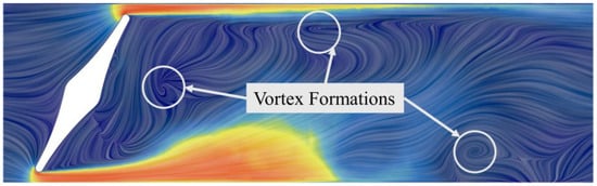 Formation of vortices: Vortex formation in flow is caused by localized rotation inside the flow caused by the localized high-velocity stream. In laminar, localized high velocity (for example, high velocity flow through the narrow opening) can cause boundary-layer separation, resulting in vortex formation. In the turbulent region, vortex formation is observed from a 15° to 45° position at Reynolds number values of 40k and 400k. However, these vortices diminish after this valve position and are not observed in wider openings. In 15° conditions, several vortices are observed approximately 6D downstream. At 30° and 45° positions, this region is observed to be shrunken, 4D and 3D, respectively. Vortex formation and swirls are not observed in wider valve positions.