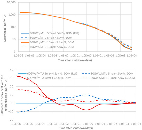 Lattice decay heat (top) and difference in decay heat with reference (bottom) after shutdown at 40% void fraction for different lattice designs with maximum (max) and average (av) enrichments.