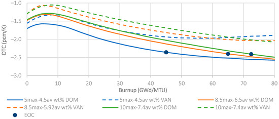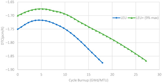 The Doppler temperature coefficient (DTC) becomes smaller in magnitude with increasing enrichment at the beginning of cycle (BOC). The difference in DTC decreases with increasing burnup. However, the relative difference can reach up to 20% in the midcycle (7–10 GWd/MTU), decreasing to 3% with burnup at the end of cycle (EOC). When relative cycle lengths are considered (black dots, Figure 2), EOC values remain the same for all enrichments.