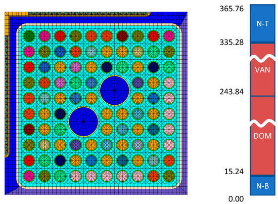 Each BWR 10 × 10 lattice was modeled with specifications as close as possible to those of a GE14 design using design parameters collected from public resources [13,19]. A representative Polaris model is shown in Figure 3. Considering the most important axial variations, only natural top (N-T), VAN, DOM, and natural bottom (N-B) lattices were included in the assembly design. In order to use realistic lattice designs anticipated to be used in LEU and LEU+ core loadings while avoiding computationally expensive iterative optimization studies, a selected set of lattices with several enrichment variations was generated in a previous study [7] to support follow-on core design calculations. DOM and VAN lattices with maximum enrichments of 6%, 7%, 8%, 9%, and 10% were designed using a machine learning optimization algorithm with the following lattice physics objectives to capture general characteristics of a realistic lattice design: