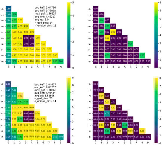 LEU and LEU+ pin enrichment maps (left) and gadolinia loadings (right).