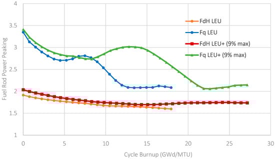FdH and Fq pin power peaking factors for Core 2 LEU and Core 2 LEU+.