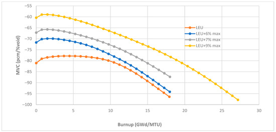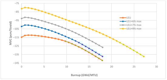 The MVC for LEU and LEU+ cores (6% max and 7% max for 24-month-cycle Core 3 and 9% max for 36-month-cycle Core 2) is compared in Figure 8 and Figure 9 for high-void (70–40%) and low-void (40–10%) regions. Both regions show similar trends during the cycle. Although differences between LEU and LEU+ (9%) cores can be as high as 35 pcm/%void at BOC for high-void regions (24 pcm/%void for low-void regions), at EOC, both cores have negligible differences (3 pcm/%void). As noted in the Phase I study, MVC decreases with increasing enrichment. The Phase I study also showed that MVC is close to 0 pcm/% void at BOC; however, at the core level, MVC does not drop below −85 pcm/void % for high-void conditions and −65 pcm/void% for low-void conditions throughout the cycle.