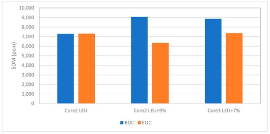 As shown in Figure 10, both LEU+ cores have higher SDMs than the LEU core at BOC. The largest SDM increase is for core2 with 9% max fuel. The improvement in BOC SDM with increasing enrichments comes from the reduced reactivity contributions from DTC and MVC after shutdown, because both phenomena increase reactivity at shutdown. Despite the BOC trends, at EOC, SDM is reduced for an LEU+ (9% max) core by 750 pcm compared to that of the LEU core. However, a similar reduction is not observed for the 7% max core3 design. Core design and excess reactivity at EOC play important roles for the observed reduction in SDM.