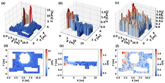 Distributions of recorded survey data, in 3d (a–c) and from a top-down view (d–f). The reactor on scenario is represented with (a,d), the hallway scenario is represented with (b,e), and the reactor off scenario is represented with (c,f).