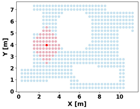 An example of thresholding for RL-states with = 5 for demonstration. Red points represent the subset that will be used for RL, the bright red point is where the agent is located.