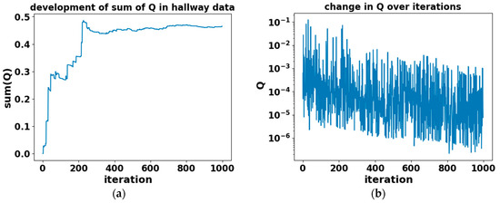 Examples of the sum(Q) changing over MC iteration (a) and the change in sum(Q) over MC iteration (b).