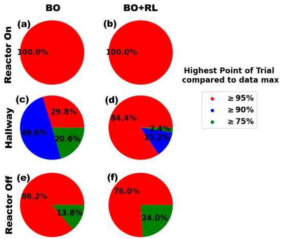 Pie charts show how often the true maximum point was found for each scenario. Reactor on is represented with (a,b), the hallway scenario is represented with (c,d), and the reactor off is represented with (e,f). The left column (a,c,e) represents the BO-only experiments, while the right column (b,d,f) represents the BO+RL experiments.