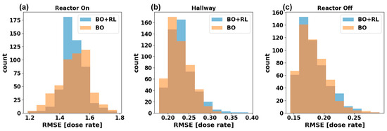 Histograms representing the distributions of RMSE for BO and BO+RL simulations, (a) for the reactor on scenario, (b) for the hallway scenario, and (c) for the reactor off scenario.