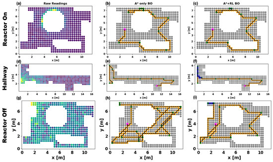 Comparison of behavior of BO and BO+RL on all three scenarios. Orange points represent high uncertainty sampling; blue dots represent RL-guided movement, and green dots represent static samples. The beginning point is shown in magenta. Rows correspond to a scenario where (a–c) represent the reactor on scenario, (d–f) represent the hallway scenario, and (g–i) represent the reactor on scenario. Columns represent the data overlay, with (a,d,g) representing the raw survey readings, (b,e,h) representing a BO-only investigation path, and (c,f,i) representing BO+RL investigation paths.