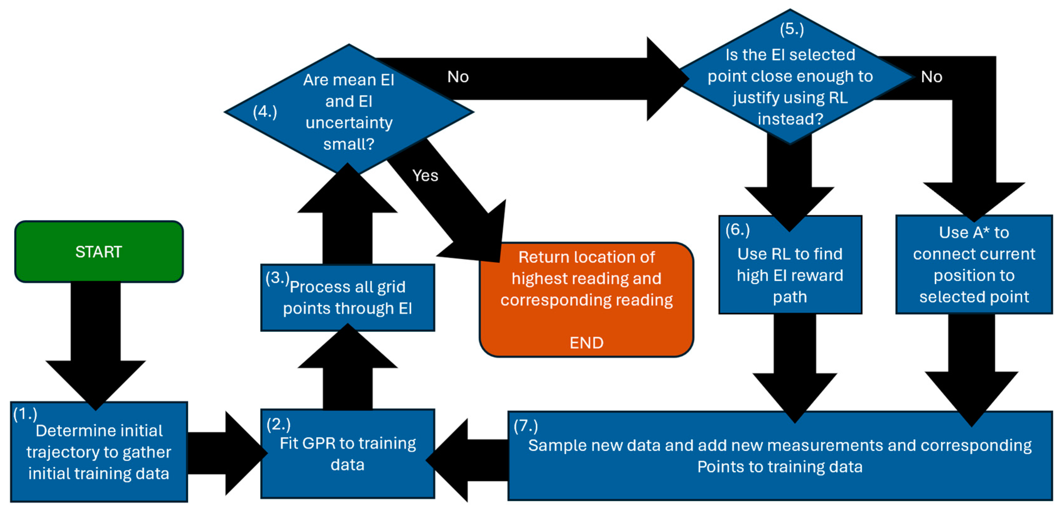 BO has been observed to be very effective in efficiently tackling global optimization problems within many fields [6]. It is supposed that BO could provide an effective method in radiation surveying and localization because it can provide precise and explainable uncertainties, and at each step provides easily analyzable data for a human operator to quickly understand and take control of the search process if needed [7]. However, the usual framework of BO is not a perfect fit for a quick and effective radiation survey, as it only specifies points to examine at the next step and does not account for the inefficiency incurred via the transportation of the surveyor. Not only does this make the process less efficient, but it throws away what could be useful data from the transportation step (i.e., while moving to a new spot, readings are still recorded). It is hoped that reinforcement learning (RL) can add path-planning capabilities to BO, making it more efficient for localizing and surveying radiation fields. It is also vital to consider that radiation penetrates most materials at a proportional rate per length, determined by nuclear characteristics and atomic density. This intense material attenuation makes radiation unique among commonly sought-after signals, such as light and radio.